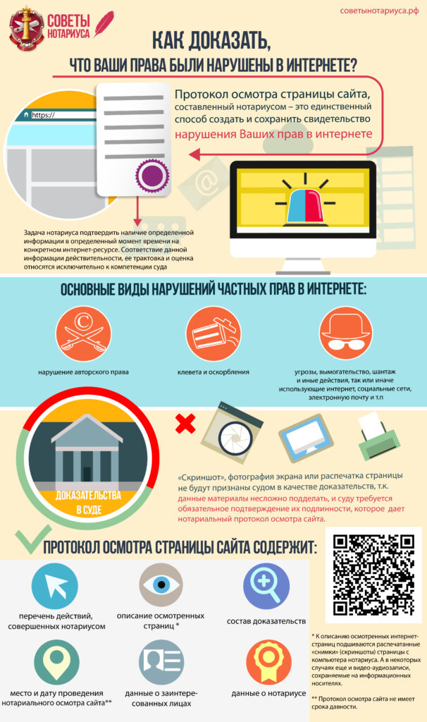 В последнее время обеспечение доказательств в Интернете становится все более востребованной услугой. Со стремительным ростом количества сайтов растет и необходимость обеспечения доказательств в Интернете. Обеспечение доказательств в Интернете может осуществляться для подтверждения нарушения фактов при следующих нарушениях: